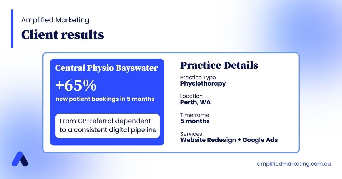 Central Physio Bayswater increased new patient bookings by 65% over five months after we rebuilt their website for conversion and launched a targeted Google Ads campaign. Before that, they were relying heavily on GP referrals and walk-ins — solid, but not scalable.
